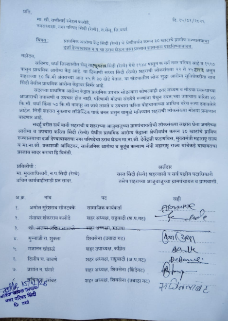 सदर्ह वरील सर्व बाबी शहराची व शहराच्या आजुबाजुच्या ग्रामपंचायतीची लोकसंख्या लक्षात घेता जनतेच्या आरोग्य व उपचारा करिता सिंदी (रेल्वे) येथील प्राथमिक आरोग्य केंद्राला श्रेणीवर्धन करून ३० खाटांचे ग्रामिण रुग्णालयाचा दर्जा देण्याबाबतचा नगर परिषदेचा ठराव घेऊन देवेंद्र फडणविस, मुख्यमंत्री महाराष्ट्र राज्य व प्रकाश आंबिटकर, सार्वजनिक आरोग्य व कुटूंब कल्याण मंत्री महाराष्ट्र राज्य यांचेकडे याबाबतचा प्रस्ताव सादर करावा असे निवेदन नगराध्यक्षा राणी कलोडे यांना देण्यात आले.