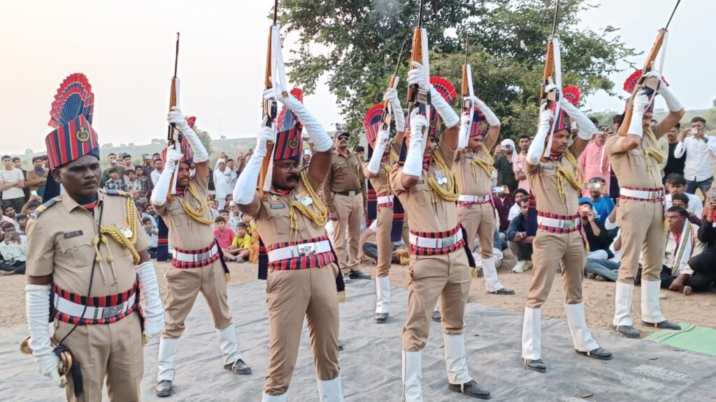 यावेळी सैनिकी विभागाच्या वतीने मानवंदना देण्यात आली. पोलीस विभागाच्या वतीने बंदुकीच्या तीन फैरी झाडून सलामी देण्यात आली.