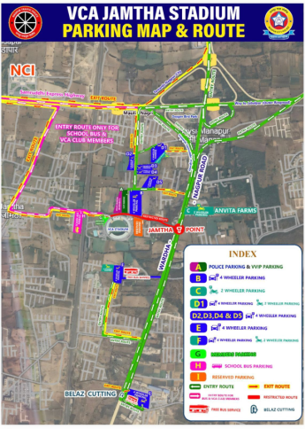 जी वाहने जामठा टी पॉईंट क्रॉस करणार आहेत, त्यांच्यासाठी अल्ट्राटेकपुढील पार्किंग येथे चार चाकी पार्किंग उपलब्ध राहणार आहे. त्यांच्यासाठी फिडर बसची सोय आहे. दुचाकी व चारचाकी वाहनांच्या येण्याचे (एंट्री रूट) व बाहेर पडण्याचे (एक्झीट रूट) निश्चित करण्यात आले असून वाहनचालकांनी कोंडी टाळण्यासाठी त्यांचे पालन करणे आवश्यक आहे. त्याचप्रमाणे वाहतूक कोंडी टाळण्यासाठी व आपला वेळ वाचविण्यासाठी क्रिकेट रसिकांनी शक्यतोवर मेट्रोचा वापर करावा, असे आवाहनही वाहतूक पोलिसांकडून करण्यात आले आहे. वाहनचालकांनी याबाबत अधिक स्पष्टीकरणासाठी वाहतूक पोलिसांकडून जारी करण्यात आलेल्या दिशादर्शक नकाशाचा वापर करावा, असेही सूचित करण्यात आले आहे.